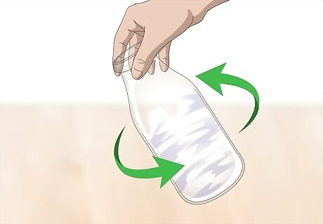 Tilt and rotate the bottle to distribute the paint. Tilt the bottle left, right, up, and down, so that the paint coats the sides. Turn the bottle on its side, and roll it back and forth across the table to help further distribute the paint. If you are worried about the paint coming out of the bottle, put the cap or cork on first.