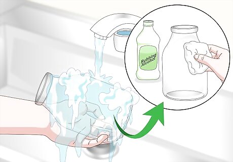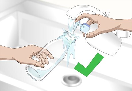 Clean the outside of the bottle, then wipe it down with rubbing alcohol. Clean the bottle with dish soap and warm water. Remove any labels and residue left by the labels. Wipe the bottle down using a paper towel soaked in rubbing alcohol to remove any oily residue, then let it dry. The good thing about using this method is that the inside of the bottle will be waterproof, so you can use is as a vase for fresh flowers. The downside is that the paint can get chipped and scratched easily.