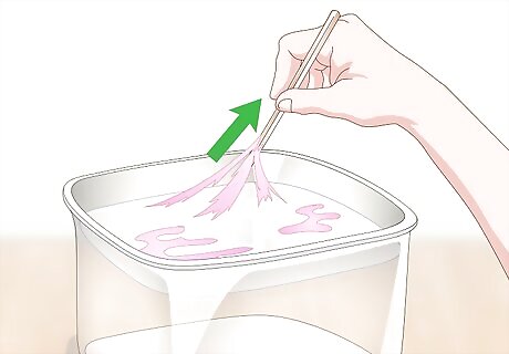 Pick up the excess nail polish from the water with a wooden skewer. Do not pour the water into the sink, or you risk clogging it. Instead, swirl a wooden skewer or paper towel in the water to catch the excess nail polish, then throw it away. Once all of the nail polish is out of the water, you can pour the water out.