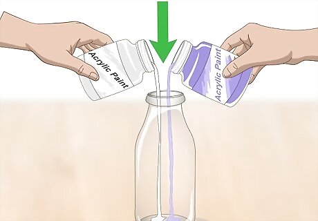 Pour 2 to 3 colors of acrylic craft paint into the bottle. How much paint you use depends on the size of the bottle. In general, 1 to 3 tablespoons (15 to 44 ml) total will be plenty. Keep in mind that you can always add more paint to the bottle after the first layer dries. Choose the colors with care. They will blend together in some areas. Contrasting colors look great next to each other, but they also make brown when mixed. For instance, you may choose to use blue, white, and purple, or red, yellow, and white.