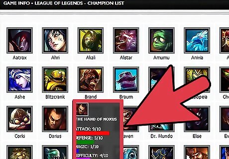 Pick a champion. You can try different champions out each week. Find your style. There are several roles you can play in the League. Marksman (ADC/Attack Damage Carry), Mage (APC/Ability Power Carry), Tank, Support, and Jungler. Each play an important role in the game. The Marksman attacks from range, dealing physical damage. The marksman are accompanied by the support character. The Mage, or APC, attacks and deals magic damage using a variety of spells. The tank is the "front line" for the team. They build defensively, able to progressively take more and more damage. The support aids the ADC (and later on the entire team). Whether the support has a slow, a stun (which is called crowd-control, or CC), or abilities to heal the ADC, they're very useful in the laning phase and are very important. The ADC depends on the support to get them "fed" (a lot of kills so they can be more useful late game). The Jungler goes around to camps on the map, and killing them. At the same time, they can gank (ambush the enemy team for a kill) for their team, and provide kills for themselves or the lanes they're ganking. Good j=Junglers know routes, buffs, have good map awareness, and know when to gank.
