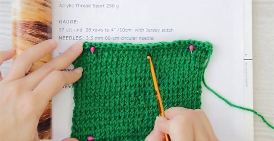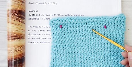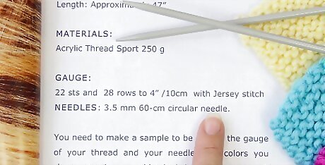 Find the gauge listed on the pattern. Gauge is near the materials section of the pattern and it tells you how many stitches and rows should fit within a small square. While you usually work the stockinette stitch to make your gauge swatch, the pattern might call for a different stitch. For example, the pattern may say, gauge: 4 inches (10 cm) on US size 7 (4.5 mm) needles = 21 stitches and 28 rows.