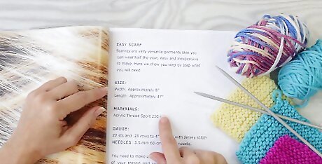 Read the pattern to choose the right yarn and needle size. The beginning of the pattern gives you all of the useful information like what size needles you need to make the project. It also tells you what type of yarn to use, how much you'll need, and might even recommend a brand. Feel free to use any yarn that catches your eye as long as it's the same weight as the recommended yarn. For example, the pattern might call for 1 skein of bulky weight (#5) yarn. When you choose your yarn, pick a skein that's also #5 even if it's called by a different name like aran or rug yarn.