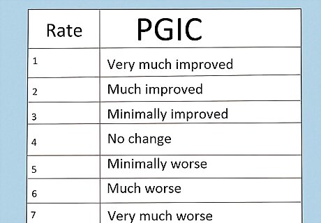 Use the Patient Global Impression of Change (PGIC) to gauge pain progress. The PGIC scale is helpful for describing your improvement (in terms of pain) over time or as a result of some sort of therapy. The PGIC asks you to rate your current status based on 7 choices: very much improved, much improved, minimally improved, no change, minimally worse, much worse, or very much worse. The PGIC is helpful for practitioners to understand how their patients are responding to treatment. The PGIC can be used for a wide variety of conditions and treatments, but it lacks more descriptive language to describe pain. The PGIC is often used in conjunction with other scales or questionnaires because it provides information on changing pain levels over time, but lacks pain intensity and pain quality measurements.