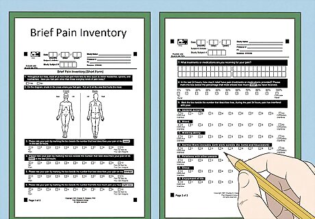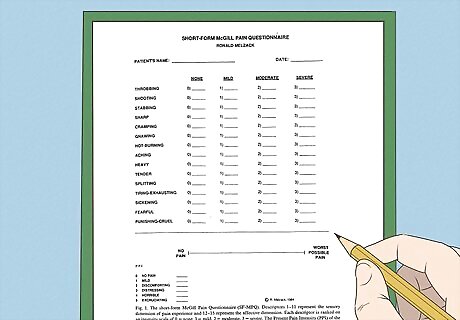 Use the McGill Pain Questionnaire (MPQ). The MPQ (also called the McGill pain index), is a scale of rating pain developed at McGill University in Canada in 1971. It's a written questionnaire that allows people in pain to give their doctors a good idea of the quality and intensity of pain they're feeling / experiencing. Patients basically choose descriptive words from different categories that best describes their pain. The MPQ is a well-validated measure of pain with extensive clinical research backing up it's relative accuracy. People can rate their pain in sensory terms (sharp or stabbing, for examples) and choose affective terms (sickening or fearful, for examples), so a doctor or therapist can review 15 total selected descriptors. Each selected descriptor is rated on a 4-point scale that ranges from none to severe, so the type and intensity of the pain can be better understood by health professionals.