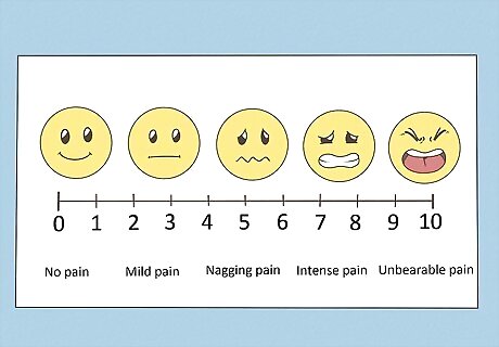 Try the Wong-Baker FACES pain rating scale. The Wong-Baker scale is especially useful for children and adults who might have trouble rating pain with other scales. The Wong-Baker scale uses a series of six faces to help patients identify what level of pain they feel. The scale gives patients options ranging from "no pain" to "the worst pain." The first face is smiling and a patient might point to that face to indicate that she is having no pain at all, while the last face is frowning and crying and a patient might point to that face to indicate that she is in severe pain.