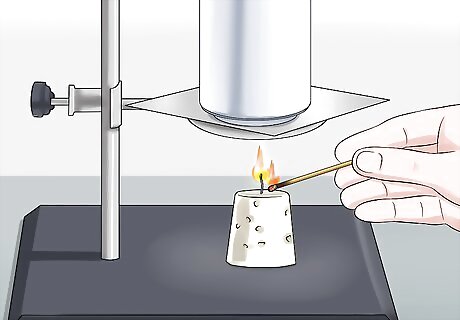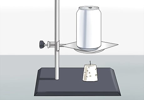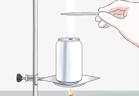 Set the can over your fuel source. Since heat rises, you will get the most heat transfer if the can is placed directly over the fuel source. Use a stand or build a simple apparatus of some kind to hold the can 6–8 centimetres (2.4–3.1 in) above the fuel source. Use metal to hold the can in place. Materials like wood or plastic might melt or catch fire, so be sure to use fire-safe materials to construct the stand.
