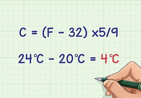 Find the difference in temperature. Subtract the initial temperature from the final temperature. This will tell you how much the water temperature was changed by the burning fuel underneath. Convert this number to Celsius if you your measurements were not in Celsius. You can convert a number from Fahrenheit to Celsius by using the equation C = ( F − 32 ) x 5 / 9 {\displaystyle C=(F-32)x5/9} C=(F-32)x5/9 where C is the temperature in Celsius and F is the temperature in Fahrenheit. An example is 24 °C (75.2 °F) - 20 °C (68.0 °F) = 4 °C (39.2 °F).