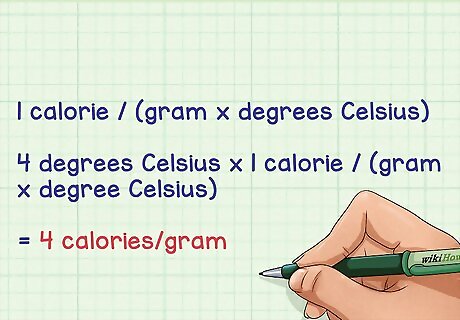 Multiply the temperature difference by the specific heat of water. The specific heat of water is the amount of heat it takes to raise the temperature of 1 gram of water by 1 degree Celsius. For water, the specific heat is 1 calorie per gram Celsius. That means it takes 1 calorie to heat 1 gram of water by 1 degree Celsius. The unit for specific heat is written as 1 calorie / (gram x degrees Celsius). Multiplying this by the temperature difference yields 4 degrees Celsius x 1 calorie / (gram x degree Celsius) = 4 calories / gram.