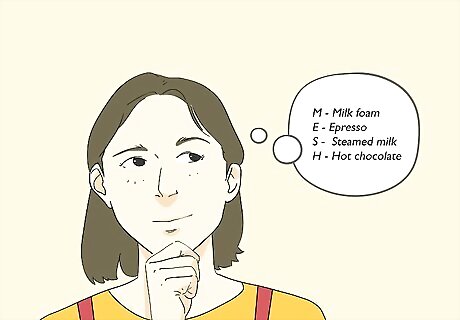 Come up with a mnemonic device for a memorization trick. A mnemonic device is a phrase or set of letters that will help you remember the details of the recipe you’re trying to memorize. For example, if you’re trying to remember the ingredients in a pesto chicken bake dish, you might create the phrase “Please Take My Chick!” which stands for the ingredients pesto, tomato, mozzarella cheese, and chicken. Another example might be remembering the word “MESH” which stand for milk foam, espresso, steamed milk, and hot chocolate if you're trying to make a mocha latte. Mnemonic devices work for memorizing measurements that go along with ingredients too.