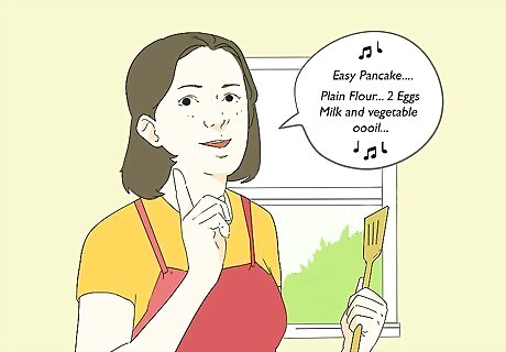 Make up a song about the recipe to help you remember ingredients. This is a fun way to learn recipes quickly and have them stick in your brain for a long time. Sing the list of ingredients to the tune of a song you already know or make up your own tune that goes with the recipe. When you go to recall the recipe, you can sing the song out loud or in your head to remember it. Simple tunes or songs are especially useful for recipes that only have a few ingredients, like drinks.