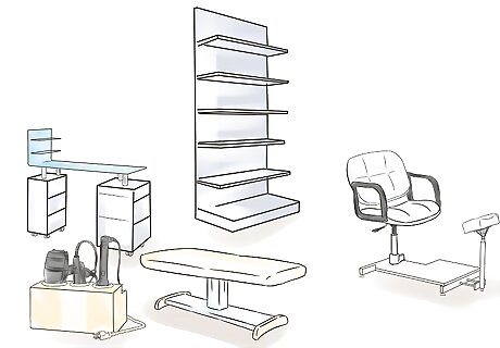 Buy equipment for your lobby and spa treatment rooms. Depending on what you offer, you will need a front counter or desk, computer system with scheduling software, product shelving, hair styling stations and tools, massage tables, pedicure chairs, manicure tables, facial equipment and linens for every room. You will also need relaxing music to use throughout the facility.