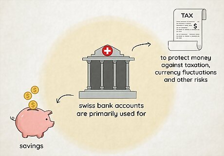 Understand what swiss bank accounts are primarily used for. Swiss private banks generally do not offer standard checking or savings accounts to foreigners. Rather, the main purpose of these accounts is investment. This means that these accounts can not be used for regular withdrawals to pay for things like your mortgage, car payment, etc. Most people use these accounts to store large sums of money, usually as a method of protection against external forces, like taxation, risk in their home country, or currency fluctuations.