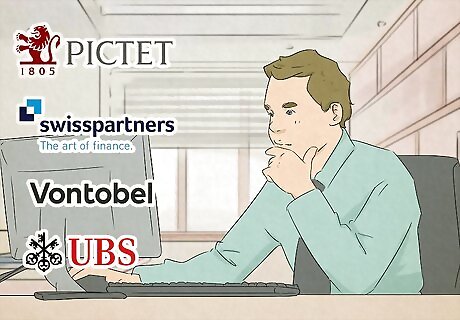 Choose a bank. Switzerland has a number of different types of banks, from large, international banks to smaller, regional banks that only serve a small geographical area. However, the private banks that cater specifically to wealthy and international clients are generally separate banking entities entirely. That is, they are rarely connected to banks offering regular banking services in Switzerland. Private banks can either be located through an online search for "private Swiss bank" or through a banking broker. A few of the more well-known of these banks are: Pictet Private Banking. SwissPartners. Vontobel Private Banking. UBS Private Banking.