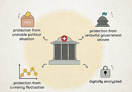 Know how your money will be protected. Swiss private bank accounts are generally used to protect money from unstable political or economic situations in the home country of the depositor. Many of these accounts are held as Swiss Francs (the currency of Switzerland), which is a very stable currency. This protects depositors from fluctuations in the value of their home currency which could devalue their assets. Additionally, money in these accounts is protected from unlawful government seizure and digitally encrypted to prevent theft. Despite popular opinion to the contrary, money in these accounts is not safe from the taxation of your home country. By law, your account balances must be reported to your home country's tax authorities.