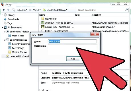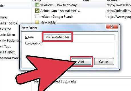 Name the folder. In the New Folder window, type a name for the folder, and if you like, a description or memo of what's inside. The new folder will appear in the sidebar inside the folder you clicked on to create it. Repeat this procedure until you have what you think will be a good start to your bookmark filing system. Remember, you can always add more!
