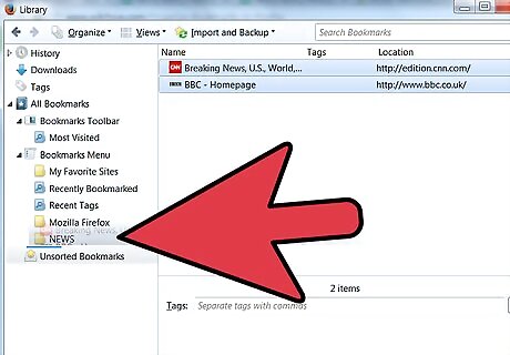 Move a bookmark to the new folder. Click on the bookmark you want to move and drag it to the new folder. Release the mouse button to place the bookmark in the folder. Repeat this procedure until you have all your bookmarks placed. You may need to create new folders for categories you missed, and you may end up having created categories you're not using.
