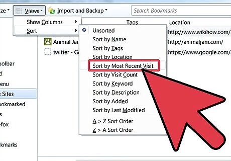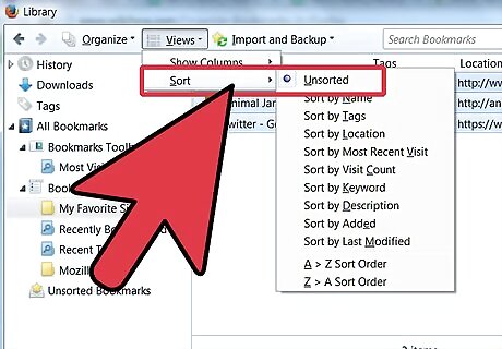 Temporary sort. There may be times when you want something other than a basic name sort. To do this, open the Library window. On the menu bar, click Bookmarks and select Show All Bookmarks. In the left pane, click on the folder you want to view. Its contents will appear in the main window on the right. Click on the Views button at the top, and select the Sort menu, and choose a sort order. Note that this is a temporary sort order in the Library window, and is not reflected in the Bookmarks menu or sidebar.