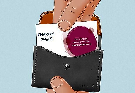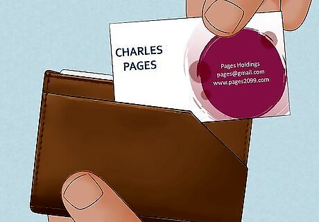 Have your own cards handy. In most cases, people don’t just hand each other business cards--they trade them. Facilitate a business card swap by keeping your own cards with you in professional settings like meetings and trade shows, but also in your everyday life. You never know when you’re going to meet a new contact. If you’re having trouble keeping your cards neat, try designating a special pocket or folder for them. A rubber band also works, in a pinch. Never just hand over your card without asking--this can be seen as pushy. Instead, say something like “I’d really like to talk to you more about what you do. Would you like to exchange cards?”