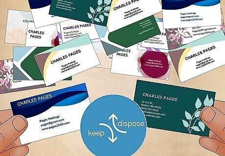 Cull your existing collection. If you’ve been in business a long time already, you might have a sizable stash of business cards that need to get organized. Before you start organizing the ones you may still find useful, save time by going through your cards and disposing of all the ones that might not be useful anymore. Get rid of business cards you don’t recognize. They won’t do you any good. Get rid of business cards that advertise defunct services or companies. Save really nostalgic cards (e.g. the card for the restaurant where you got engaged), but set them aside.