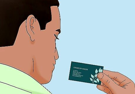 Read the card when you receive it. Examining the business card for a second or two is a good way to make note of important information about a new contact. If you struggle with remembering names, use cards as a tool to connect names to faces. The person's title is usually printed on a business card, too. This is another clue about who they are and what they do.