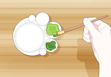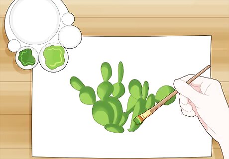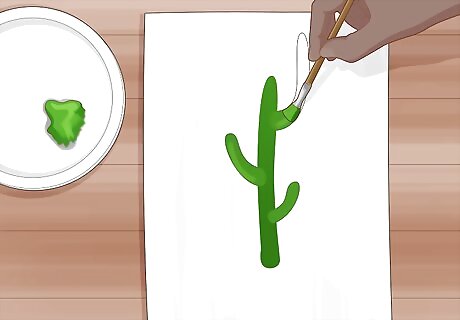 Paint the entire cactus with green paint using a natural-bristle brush. Place a dab of green oil paint on your palette and dip a natural-bristle brush in it, making sure to wipe off any excess. Stay inside your outlines and load your brush with more paint as you start to run out. Make sure the entire cactus has a thin, even layer of paint so you can’t see the surface underneath it. You can buy oil paints from an art supply or craft store., Oil paints will stain your clothing and other fabrics, so wear clothes that you don’t mind getting messy and protect any surfaces in your work area.