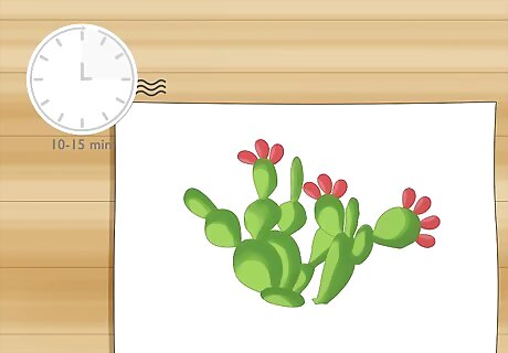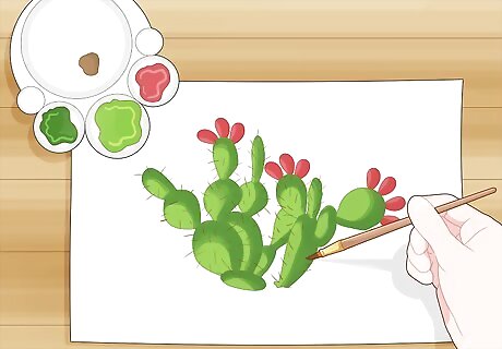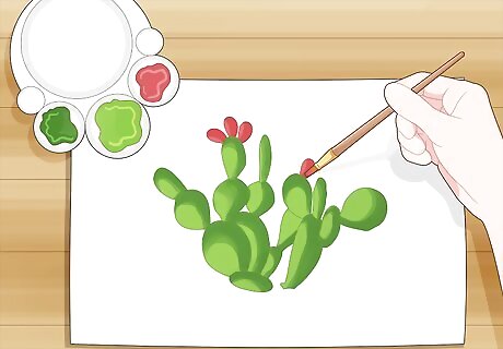 Use red or pink paint to add flower petals on the tops of the cactus. Dip a round-bristle brush in a light red or pink paint and wipe off any excess. Start the flower on top of one of the smaller cactus branches. Set the brush down on your work surface and pull it in a short oval-shaped stroke to add a petal. Add 2–3 more petals next to the first one to complete the flower. Add 3–4 random flowers on top of other branches on the cactus so they’re evenly spread out. Avoid touching the green paint with your brush since you may lift it up and tinge the color of your flowers. Some cacti have yellow flowers, so can use yellow paint instead if you want.