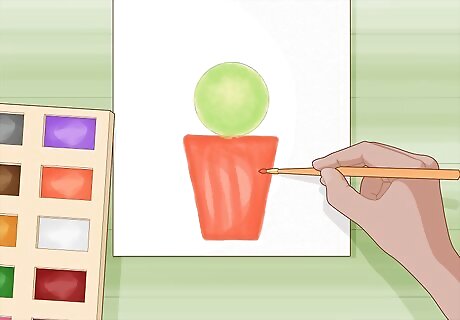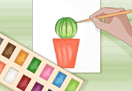 Paint the pot any color you want to add a decorative touch. If you want to make the pot look like terracotta, try using an orange or red watercolor paint for the pot. Otherwise, you can use any color you want. Apply an even layer of the color inside the outlines first, and load your brush with more paint before going over areas that you want darker. If you want the pot to look white, use light grey watercolors around the edges of the outline to make it look like there are shadows on the pot.