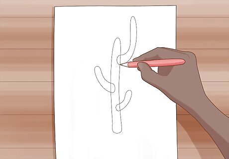 Add cylindrical branches coming out from the sides of the trunk. Choose a spot in the middle of the cylinder where you want to make a branch extend out. Make a tube shape that’s narrower than your first cylinder and extends up toward the top of the painting. Sketch in the branch so it’s lower than the highest point of the trunk and has a rounded top. Add 2–3 branches to the trunk to make your cactus look more prominent. Try to use the same number of branches on each side of the cactus to keep the composition of your painting balanced.