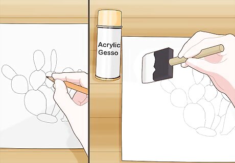 Draw a series of connected ovals stacked vertically for your cactus. Start near the bottom of the paper or canvas and sketch in a large vertical oval shape. Taper the bottom of the oval so it’s narrower than the top. Draw additional ovals that are smaller than the first one coming out of the top or sides to make it look like the cactus has more branches. Add as few or many ovals as you want depending on how full you want the cactus to appear. Put an upside-down trapezoid underneath the first oval you drew if you want to make it look like it’s growing inside a pot. Gesso your work surface before drawing if you want the paint colors to stand out more. Apply a thin layer of acrylic gesso with a foam brush and let it dry for 4 hours before you start working.