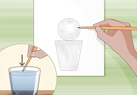 Spread water inside the outline of your drawing with a watercolor brush. Dip a watercolor paintbrush into a cup of clean water to wet the bristles. Shake off any excess water before applying it to the paper. Stay within the outlines of your drawing as you wet the paper so the colors flow more easily when you begin painting. Only apply enough water to just get the surface wet, or else you may rip through the paper. Applying water to the paper helps the colors look more transparent so you can layer the colors easier.Tip: If you get water outside of your outlines, dab it with a paper towel to dry the paper off.