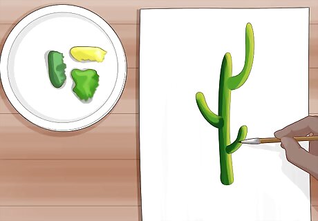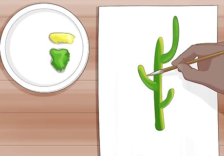 Brush in highlights on one side of the cactus with yellow paint. Load a yellow or lighter tint of green on your brush and go over areas where you want highlights on your cactus. As you paint, the yellow or light green will mix with the original color you used to create a gradient so it looks like there’s a light source shining on the cactus. Continue painting one side of the cactus with the color until you’re happy with how it looks. Avoid using white for highlights since it will look unnatural on the cactus.