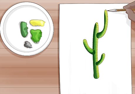 Add lines of black dots following the curves of the cactus for the spines. Dip the tip of your brush in black or dark green paint and wipe off any excess. Start near the bottom of the trunk and lightly dab the tip of the brush onto the surface to make a dot. Work your way up the cactus making a column of dots toward the top. When you reach the top, move the brush over and make additional columns of dots along the trunk and branches to represent the spines. You don’t need to add spines if you don’t want, but the added detail may make your painting look more realistic. Be careful not to drag your brush through the paint, or else you’ll blend in the black dots with the green background and make the colors look muddy.