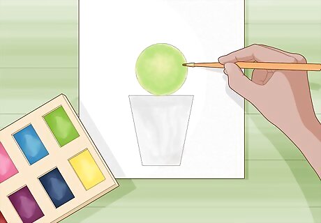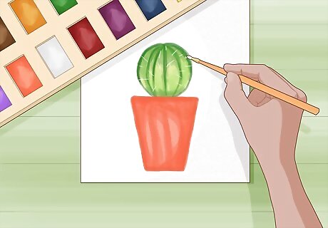 Apply green and yellow watercolor paint inside the circle to shade your cactus. Dip your paintbrush into clean water and swirl the bristles in green watercolor paint to help the color spread easier. Wipe the excess paint off of the brush and start painting inside the outline of the cactus. Spread the color evenly over the surface to create a thin layer of paint. Reapply green paint to your brush and go over areas again if you want them darker. If you want to make an area look lighter, switch to yellow paint instead. You can buy sets of watercolor paint from an art supply or craft store. If you get paint outside of the outline, quickly dab it with a paper towel so the color doesn’t stain the paper.