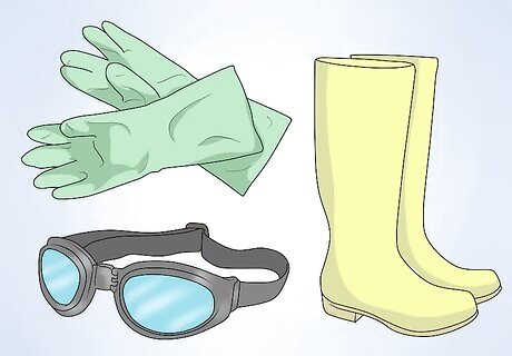 Wear personal protective equipment. This means goggles and chemical resistant gloves and boots. You will need some pretty strong stuff to get that oil off the old concrete and get it ready to accept a coat of paint.