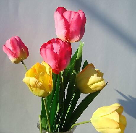 Group flower types. Pencil in a shape for a particular flower, then fill the whole shape with that flower. Move to another shape and fill it with a different flower. Use different shaped flowers and contrasting colors for richness and to carry the viewer's eye throughout the painting.