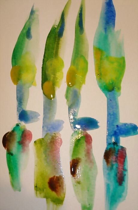 Remember that pale blue will always resemble and make viewers think of the sky. Yellow, exemplifies sunshine. Multi-colors look like sunrise or sunset. Just try to keep the background colors sheer and vibrant. Wipe with a tissue or dab out areas for fluffy clouds, if you wish.