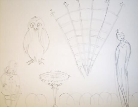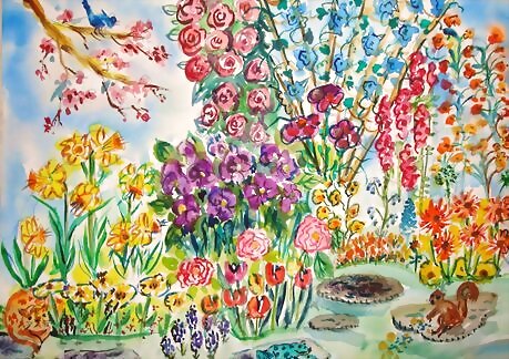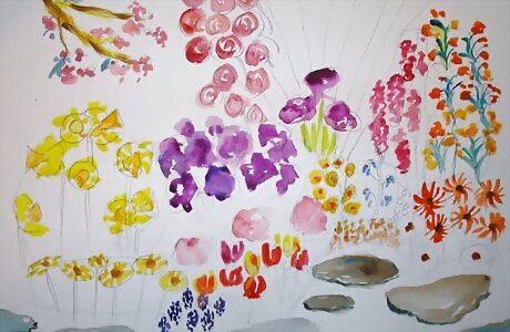 Obtain a pad of watercolor paper, 11" X 14" size #140 weight. Use an ordinary pencil to lightly sketch your flowers according to what appeals to you and what looks good on paper. Compose freely and creatively. For added interest, you might put some of the flowers in pots, ornamental planters, or hanging baskets. Add height using a trellis or strings to support climbing varieties of flower.