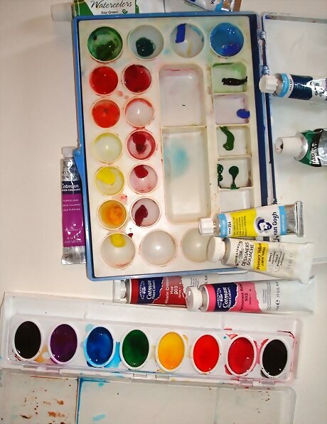 Activate your paints, if they are the dry type, with a little water on each pad. Or squeeze tube paints around the edge of your palette, keeping the center clean for mixing your colors. Take whatever colors you think you'll need, but always put the primary and secondary colors out, as well as brown. Select small and medium round brushes and a 1/2" flat. Add paper napkins or sheets from a roll of paper towels and a container of water.