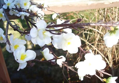 Look upward to the trees or sideways to the bushes to see flowering branches. Dogwood, apple, and cherry blossoms are delicate, round flowers growing from a small stem off a branch. The dogwood has four petals with an indentation at the top center. Cherry blossoms are pale pink and apple blossoms white.