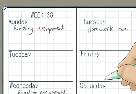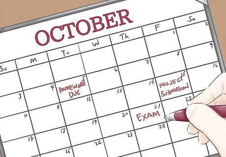 Create a calendar of due dates. If you were given a schedule for the course stating when all major assignments and projects are due and the dates of the exams, use this to create a calendar for yourself. You can do this digitally (using a phone app or computer program) or the old fashioned way (on a printed calendar) -- just choose something that you are likely to regularly check and maintain. Having a calendar like this will make you less likely to forget important dates. You can also modify it later on if any new assignments are given or dates are changed. It is a good idea to set reminders in your calendar several days or even a week or two before important due dates. Doing this may help prompt you to get an early start on your coursework so you can be as thorough as possible and get it done on time.