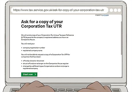 Locate your company's Unique Taxpayer Reference (UTR). When you set up your company, you'll register with Companies House to do business in the UK. Within 14 days, HMRC will mail your company's UTR to the company address you listed when you registered with Companies House. You'll need this number to register for corporation tax. If you didn't get a UTR after registering your company, you can request one online at https://www.tax.service.gov.uk/ask-for-copy-of-your-corporation-tax-utr. You'll need your company registration number and your registered company name.