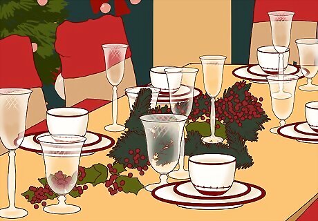 Create the right atmosphere. Set the mood for your holiday dinner by livening up your home and dining area. Make a playlist of your favorite Christmas music, dim the lights and put out festive decorations like garlands and mistletoe. When you set the table, make use of an ornate runner, or embellish with poinsettia arrangements and linens in scarlet, green, white or gold. A good dinner party is just as much about the ambiance as it is the meal, so transform your setting to embody the spirit of the season. Use candles and Christmas lights to illuminate the room rather than relying on ordinary light sources. Garnish your finished dishes with holiday-themed accents like holly and candy canes.