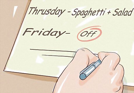 Schedule 1 or 2 “off” days each week. Don’t drive yourself crazy trying to put a full meal on the table each and every weeknight. It’s okay to take it easy once or twice per week, especially on days that are particularly hectic. Figure out the busiest evening for the week ahead and make it eat-out or take-out night. The kids won’t mind, and you’ll still be eating together! Even if you’re determined not to eat out weekly, set aside one night near the end of the work week (perhaps Thursday) as “leftovers night.” You’ll almost certainly have food left from the previous few nights, so let each person reheat what they want or create quick new dishes out of leftovers (search for recipes online).