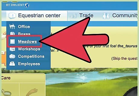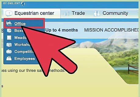 Start the equestrian center. After 30 days, you can set up an Equestrian Center (EC). Read the EC manual. Here are some things to help give your EC a bit of a jump start: When you get your EC, you are given 25,000 e. you will be tempted to buy stalls and start boarding horses right away. Don't; you will have nothing to offer prospective boarders. Instead, buy a greenhouse if they are less than 19000e, then buy a fertile six-acre meadow. Grow tons of crops and sell turnips and oats and whatever you grow at the market. Build up your money until you have roughly 100,000 Equus. Every day, buy 1000 droppings and make it into manure (on your meadow page at the top). Sell what you don't need to fertilize your crops. Keep growing crops constantly. Always have apples in Autumn, flax in Spring, and wheat in Summer sell them for profit. When you have earned 25,000e, buy 2 six-acre fertile meadows and grow crops in them as well as the ones you already have. Start to grow ingredients for health mashes and make 100 of them. Lots of people start hiring right away. Don't! Your workers can't work until you have about 20-30 boxes that are occupied! Once you have enough money, buy 6 smallest boxes, 2 fertile 6-acre meadows, and 6 rabbits. This is cost 37,980e. EDIT: rabbits are no longer on Howrse. Put your minimum skills to 4000% (so that people don't board), put flax as bedding in boxes, and put 1 meadow as pasture. Every few days, swap this meadow with another one, so the fertility and cleanliness don't go down. Make sure you have at least 10,000e, 200 carrots, and 100 health mashes always. Once you have all employees, put your min skills to 0%. Keep making mashes, carrots and making money by selling crops. When you have enough, upgrade the boxes (do it all at the same time). When you have more than enough, buy five 15 acre fertile meadows. Buy 5 scarecrows and put them in the 15-acre meadows. Upgrade boxes again. Once a week, increase the minimum skills by 20%. Start to buy 18m2 boxes (top quality) one at a time and get 2 more 15-acre meadows as pasture. Don't think this is going to be easy. It takes a long time, but it's worth it!