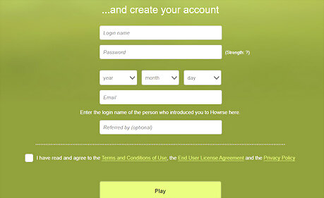 Type in your identifier (username), password, your sponsor (the person who told you about Howrse. Then enter your date of birth (birthday). It will instantly take you to the login page, where your user is already typed in; you need to type in your password. If there is no sponsor, leave it blank.