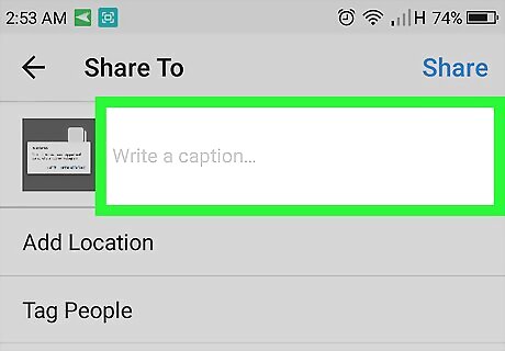 Add a post description (optional). If you want to include text with your panoramic photo, type it into the box at the top of the screen. To tag someone in the photo, tap Tag People, then follow the on-screen instructions to tag someone. To add the photo’s location, tap Add Location, start typing the name of the place where the photo was taken, then tap it when it appears in the search results.