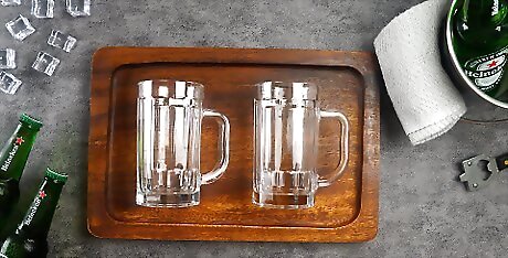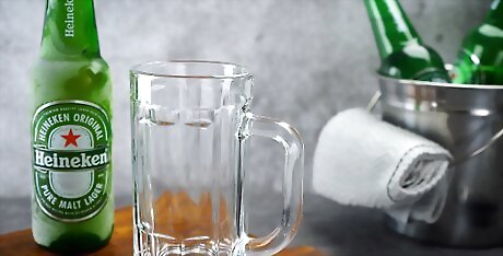 The beer will taste, smell, and look better if your glass is clean. Any beer connoisseur will tell you that beer tastes better out of a glass. Plus, with proper pouring, you’ll get a nice, aromatic head of foam. But you won’t get the same effect if you use a glass that’s dirty, oily, or covered in soap residue. Before you pour, wash your beer glass thoroughly with dish soap and a clean sponge or cloth. Rinse it carefully and let it air-dry upside down on a drying rack. Don’t let the glass dry on a cloth or towel, since this can leave lint on the rim. For the best results, give the glass a quick rinse with chilled, filtered water to cool the glass and remove any residual soap or sanitizer right before you pour. The glass should be free of any odors or obvious signs of dirt or grease.
