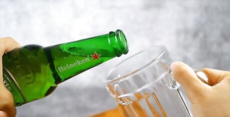 Check for damage to the bottle or signs of spoilage. If you notice chips in the glass, white flakes floating in the beer, or a ring of gunk around the inner neck of the bottle, don’t serve the beer. If it looks okay, check the cap to make sure you know how to take it off—that is, can you twist it off, or will you need a bottle opener? Additionally, check to see if the bottle has yeast in it (it will look like a layer of sediment at the bottom of the bottle). A little bit of yeast adds richness to the beer’s flavor. Gently roll or swirl the bottle before you pour to loosen up the yeast so some of it goes into the glass. If you’re not a big yeast fan, try to retain some in the bottom of the bottle when you pour. Some bottles have a cork top instead of a cap. To remove a cork, loosen the wire holding it in place and pull the cork out by hand, aiming away from your own face or anyone else’s.