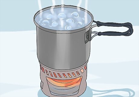 Take 8.5 cups (2.0 L) of water with you at a minimum. You'll need at least this much for an easy day hike. If you're doing a difficult hike, you'll likely need extra. It's always a good idea to carry more than you think you'll need. You can also carry an iodine tablet or a filtering straw with you in case you need to get water out of nearby streams or rivers. Insulate your water bottle to keep it from freezing. You'll need to stay hydrated, but your water can freeze while you're on the trail. A insulating sleeve can help prevent it from freezing so you can keep drinking while you're on the move! Also, make sure to keep your water inside your jacket next to your body, which will also help keep it warm.